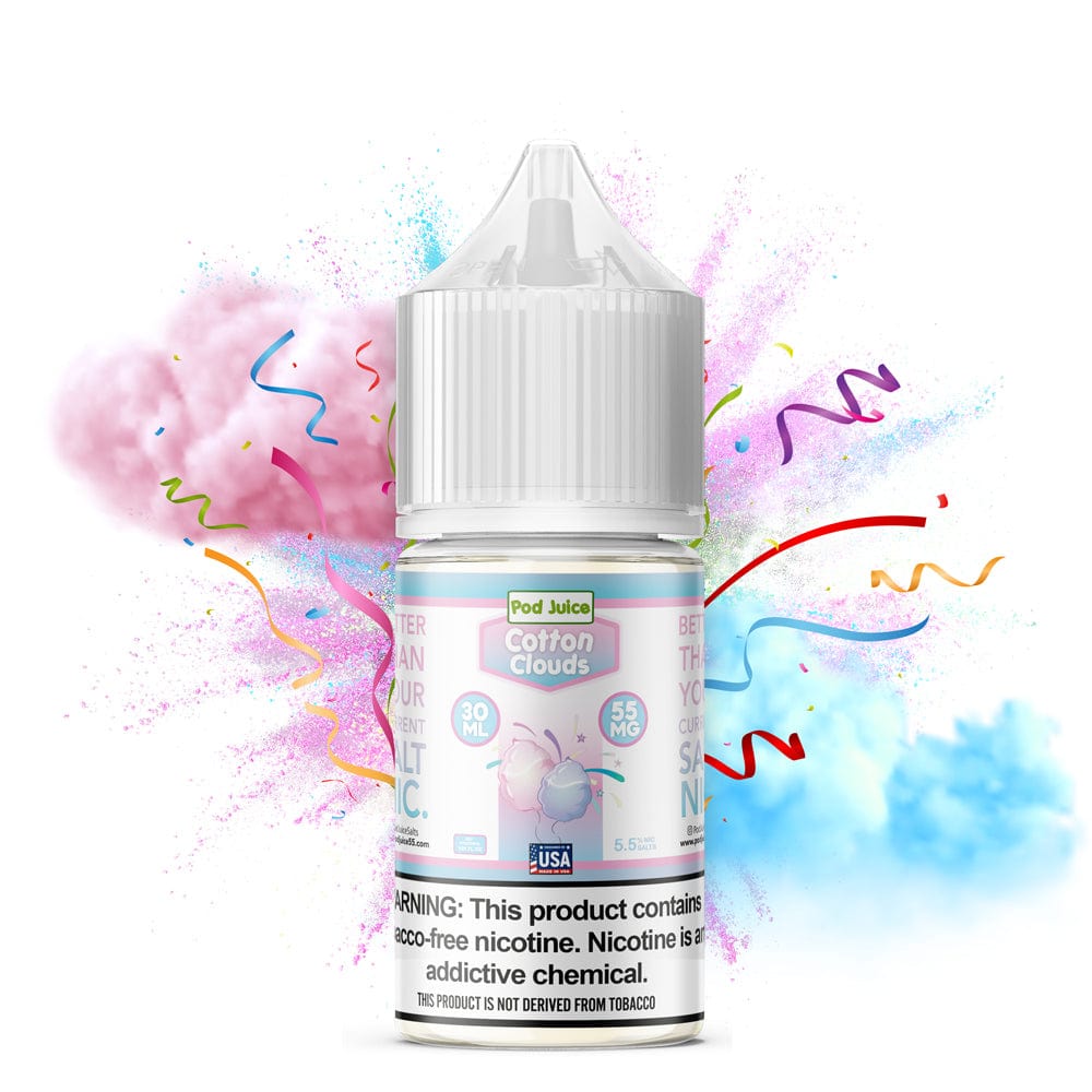 Experience the sweet, nostalgic delight of Cotton Clouds SALT by Pod Juice, formerly known as Cotton Burst. This premium e-liquid captures the irresistible essence of sugary, melt-in-your-mouth cotton candy, but without the sticky mess or the threat of cavities. With every puff, you'll be transported to a carnival atmosphere, where clouds of fluffy cotton candy swirl around, delivering a smooth and sweet vanilla flavor that lingers on your palate.